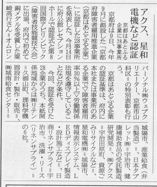 12月9日、京都府が創設した「京都府障害者雇用推進企業(京都はあとふる企業)」に認証されました。